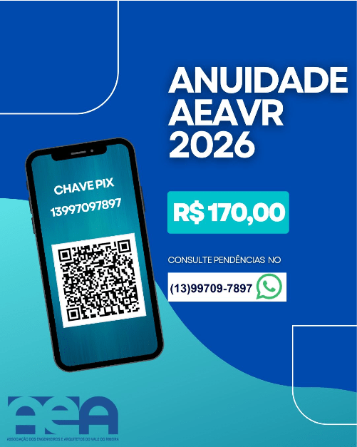 A Diretoria da Associação dos Engenheiros e Arquitetos do Vale do Ribeira ( AEAVR ), por meio da Diretoria, vem, mui respeitosamente, informar o novo valor da anuidade do ano vigente de 2026. Esperamos a compreensão de todos os associados.